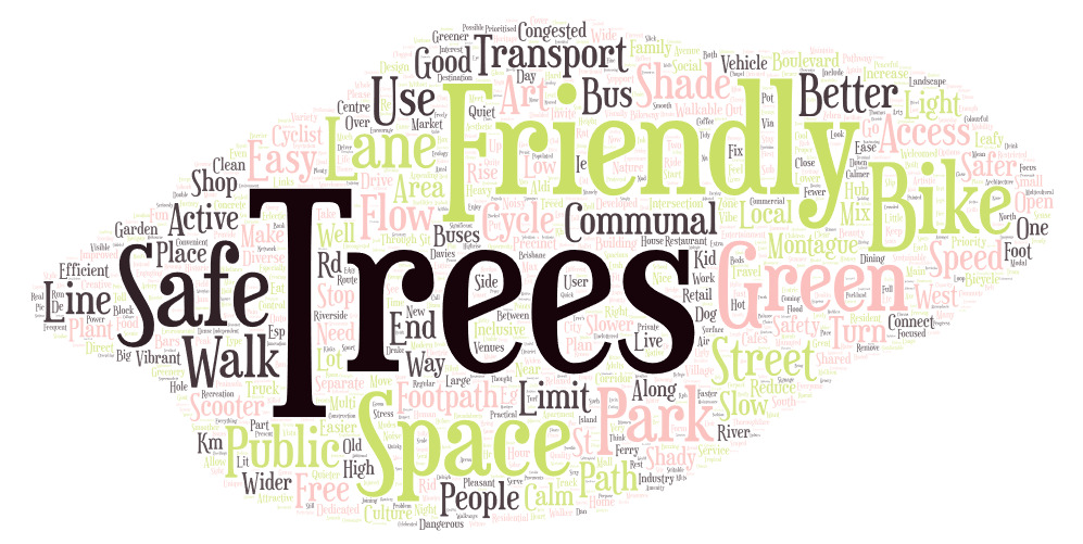 Thinking about Montague Rd and its potential to be an ideal space for you, what are three words (or phrases) you would use to describe your ideal vision for Montague Road?